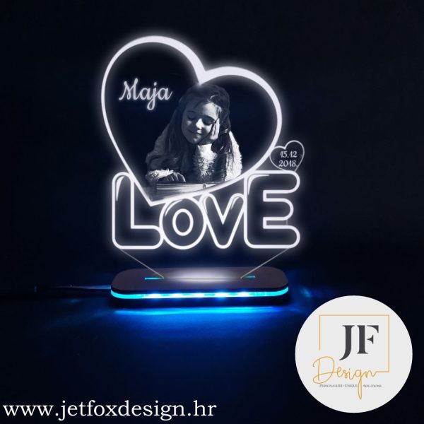 3D lampa s natpisom LOVE i fotografijom u srcu