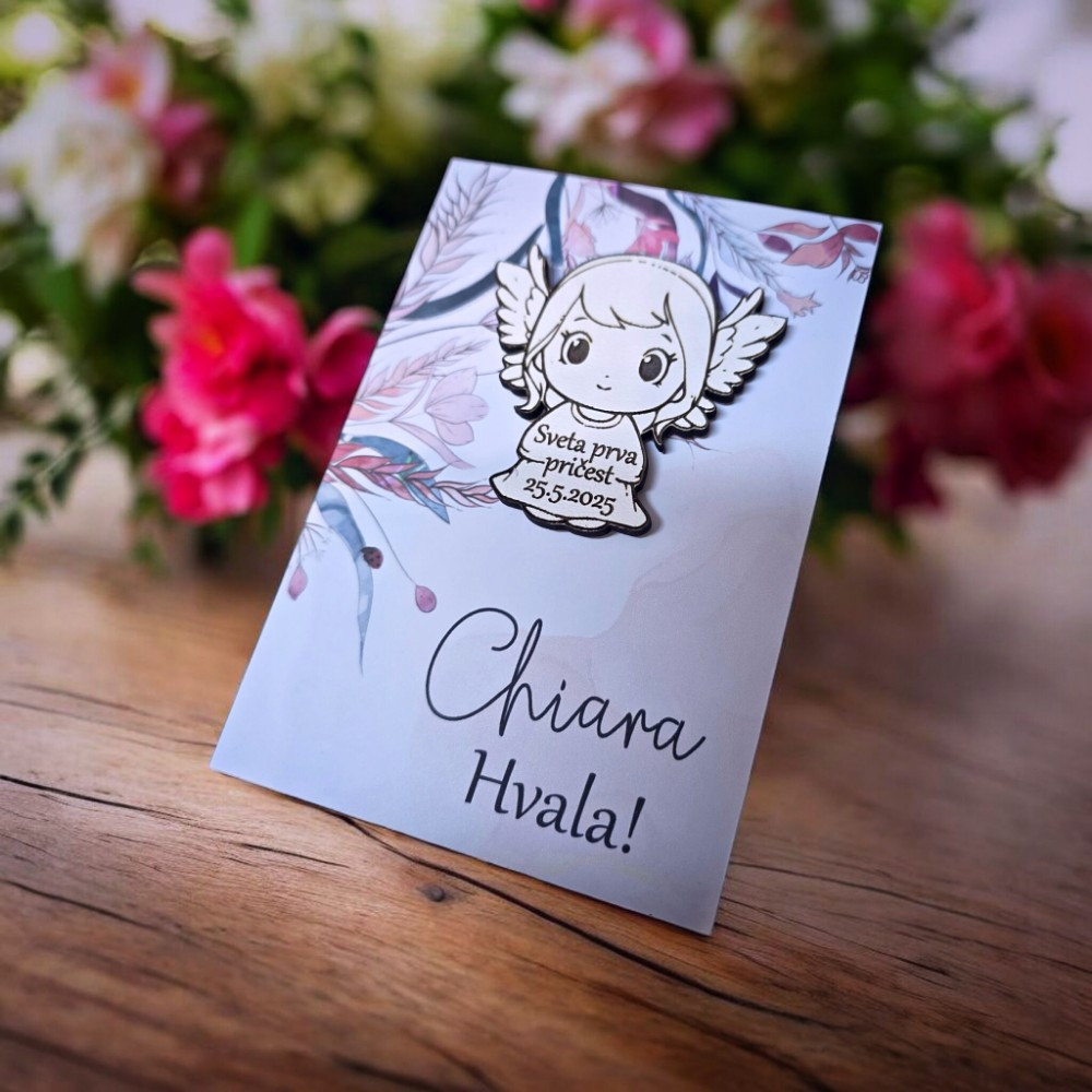 Tražiš savršenu zahvalnicu koja će oduševiti tvoje goste na krštenju?  Naša 3D zahvalnica s motivom curice anđela simbol je nevinosti, ljubavi i blagoslova. Personalizirana imenom slavljenice i posebnim tekstom zahvale, ova jedinstvena uspomena ostavlja trajni dojam i savršen je poklon za goste.  Idealno za krštenje i druge svečane prigode.
