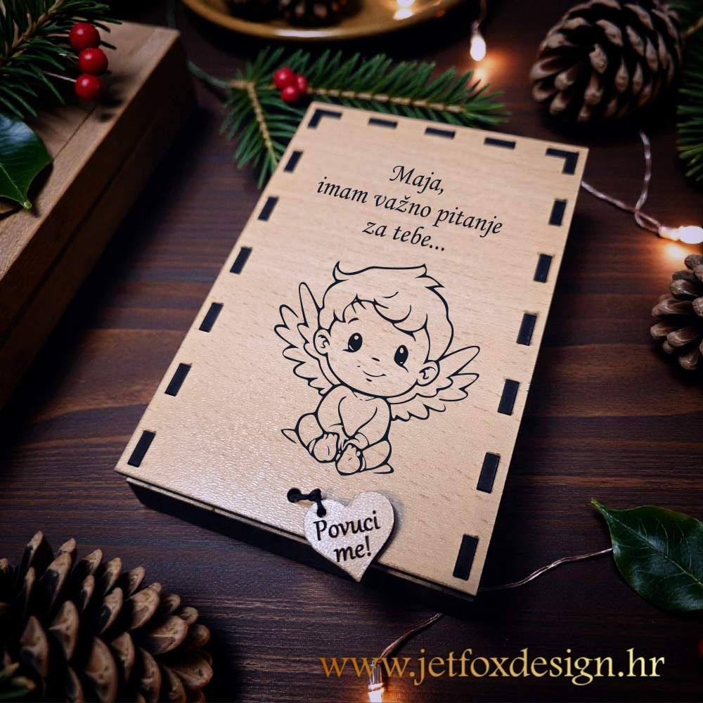 Postoje pitanja koja se ne postavljaju usput. Ona traže poseban trenutak, pažljivo odabran detalj i emociju koja ostaje zauvijek. Drvena čestitka pitalica za kumu s motivom anđela dječaka upravo je takav način da postaviš jedno od najvažnijih pitanja: Hoćeš li biti moja kuma?