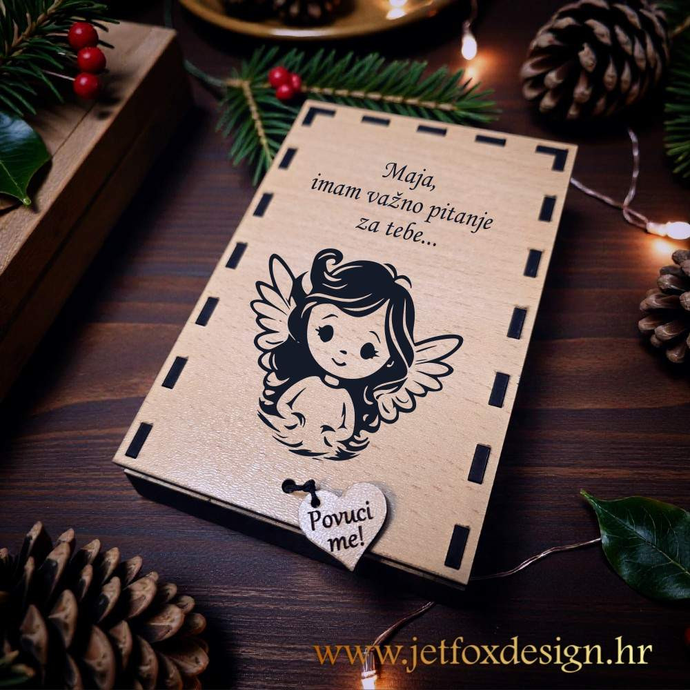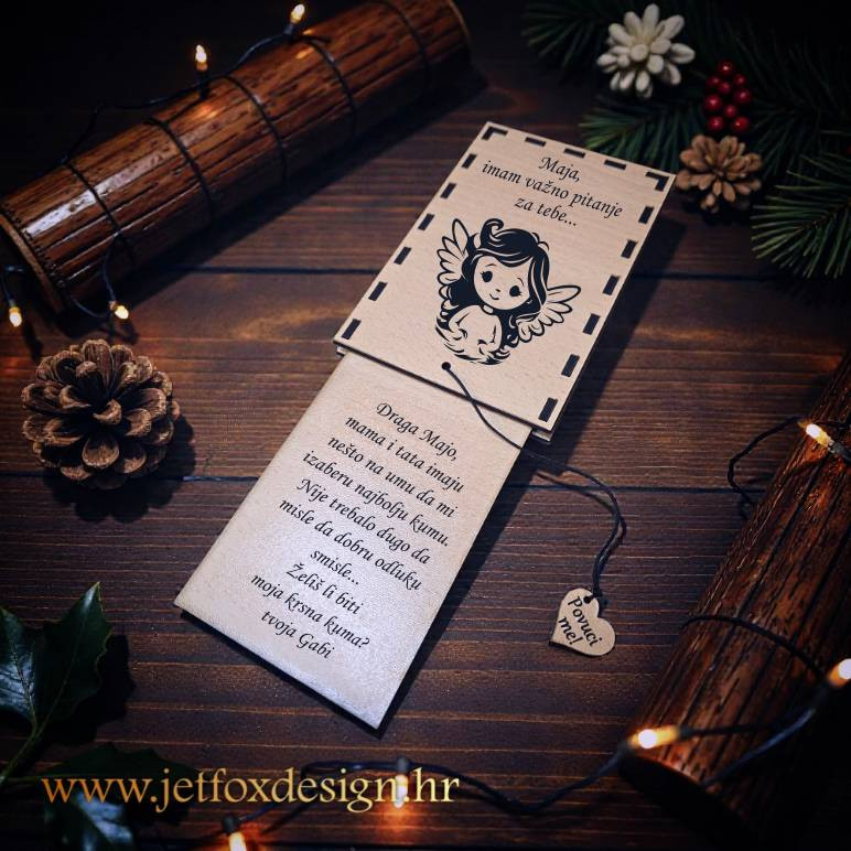 Postavljanje pitanja kumi jedan je od najemotivnijih trenutaka prije krštenja ili drugih važnih životnih događaja. Drvena čestitka pitalica za kumu s motivom anđelice curice osmišljena je upravo za takve trenutke – nježna, simbolična i puna značenja.