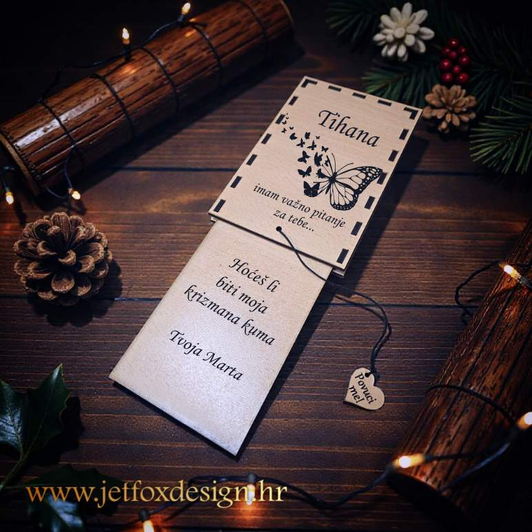 Postoje pitanja koja se ne postavljaju usput. Pitanje „Hoćeš li biti moja kuma?“ jedno je od njih. Upravo zato nastala je drvena čestitka pitalica za kumu s motivom leptira, osmišljena tako da trenutak postavljanja pitanja bude poseban, emotivan i nezaboravan.