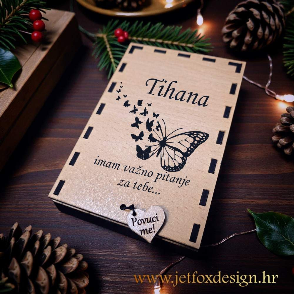Što pokloniti prijateljici, sestri ili rođakinji kada joj želiš postaviti važno pitanje? Drvena čestitka s leptirima i skrivenim pitanjem daje tom trenutku težinu i ljepotu.