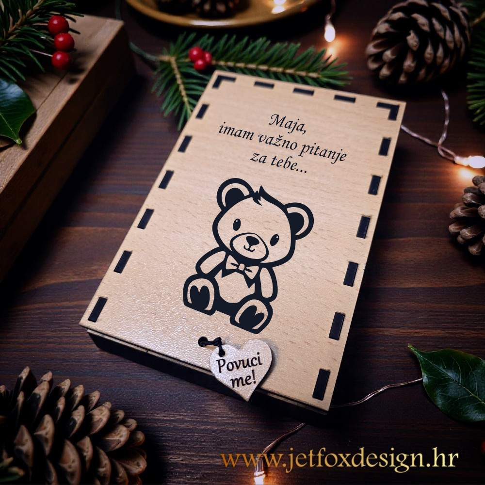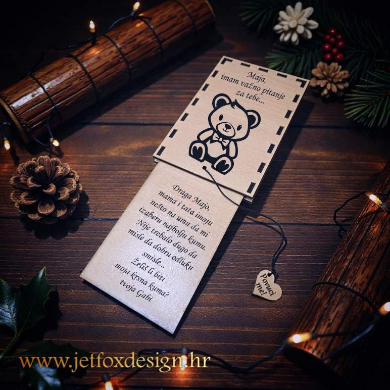 Postaviti pitanje „Hoćeš li biti moja kuma?“ poseban je trenutak koji se pamti cijeli život. Drvena čestitka pitalica za kumu s motivom mede osmišljena je upravo za takve trenutke – topla, nježna i emotivna, savršena za pitanje koje dolazi iz srca.