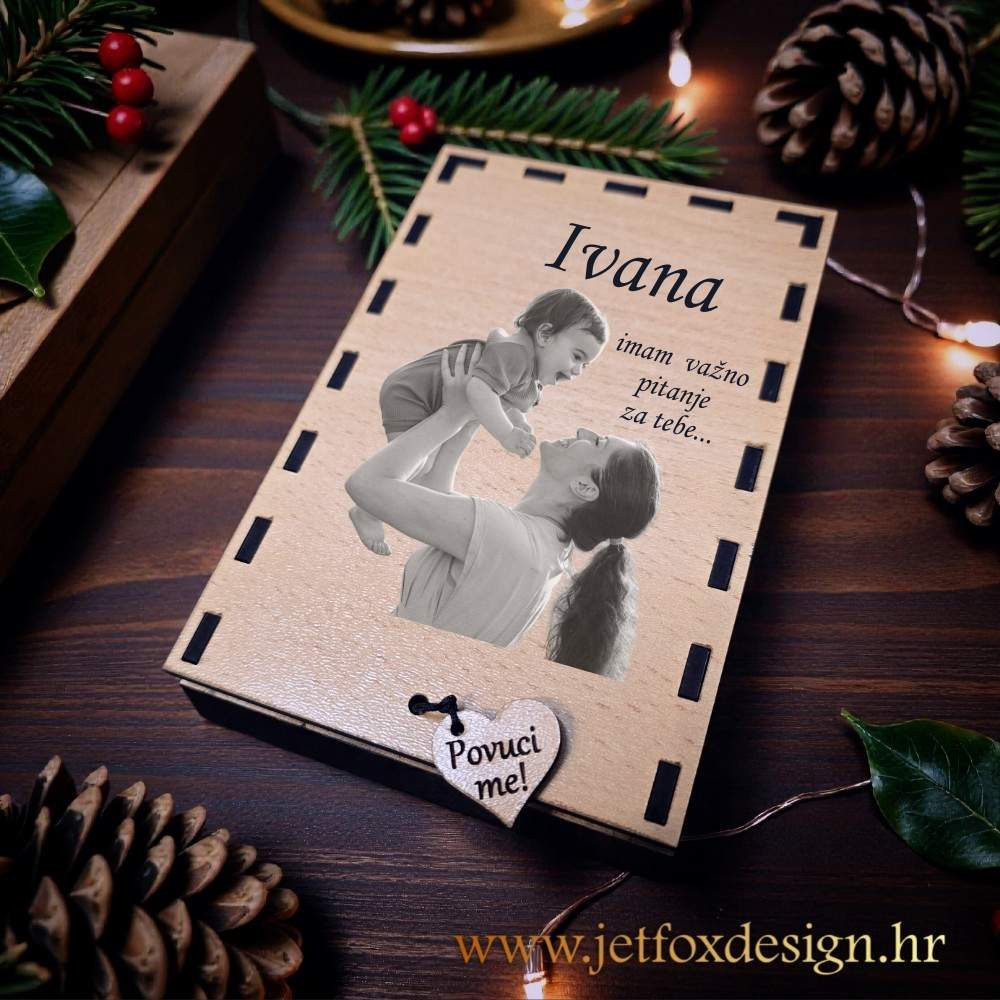 Ova čestitka s pitanjem hoćeš li biti moja kuma personalizira se fotografijama bebe i buduće kume, čime cijeli poklon dobiva snažnu emocionalnu vrijednost. Fotografije stvaraju trenutnu povezanost i čine pitanje još osobnijim.