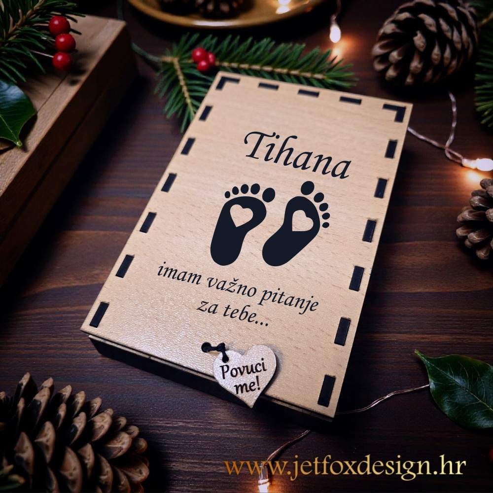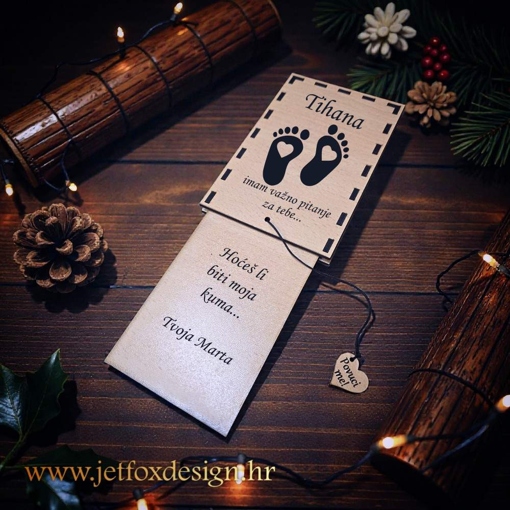 Pitanje „želiš li biti moja kuma“ nosi posebnu emociju i zaslužuje biti postavljeno na način koji se pamti cijeli život. Drvena čestitka pitalica za kumu na izvlačenje s motivom stopala osmišljena je upravo za takve trenutke – nježno, simbolično i iskreno.