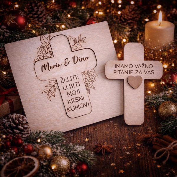 Ova čestitka nije obična poruka na papiru. Ona je mali znak poštovanja prema osobi kojoj se obraćaš. Personalizirana imenom i tekstom po želji, čestitka s križem i pitanjem za kumstvo pretvara sam čin postavljanja pitanja u poseban i nezaboravan trenutak.