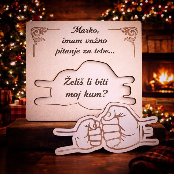 Kako pitati kuma, a da pitanje zvuči iskreno i prirodno? Tako da mu daš simboliku prijateljstva. Motiv prijateljske šake jasno govori o odnosu koji imate, a posveta dodatno pojačava emociju.