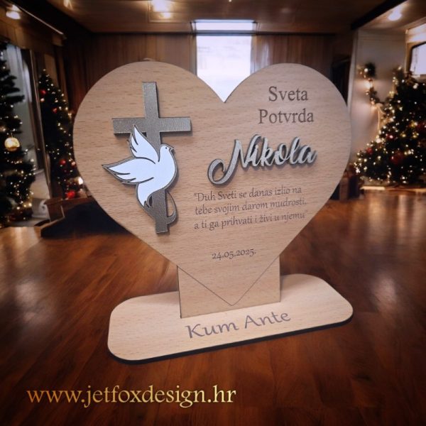 Srce simbolizira ljubav i čistoću, dok golubica predstavlja mir, vjeru i Duha Svetoga. U kombinaciji s imenom djeteta i posvetom po želji kupca, ova dekoracija postaje osoban i emotivan dar koji ima pravo značenje.