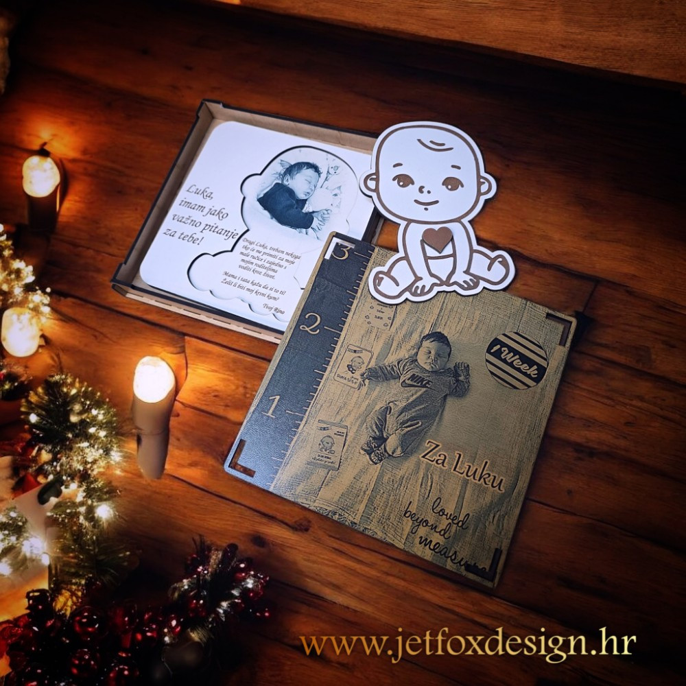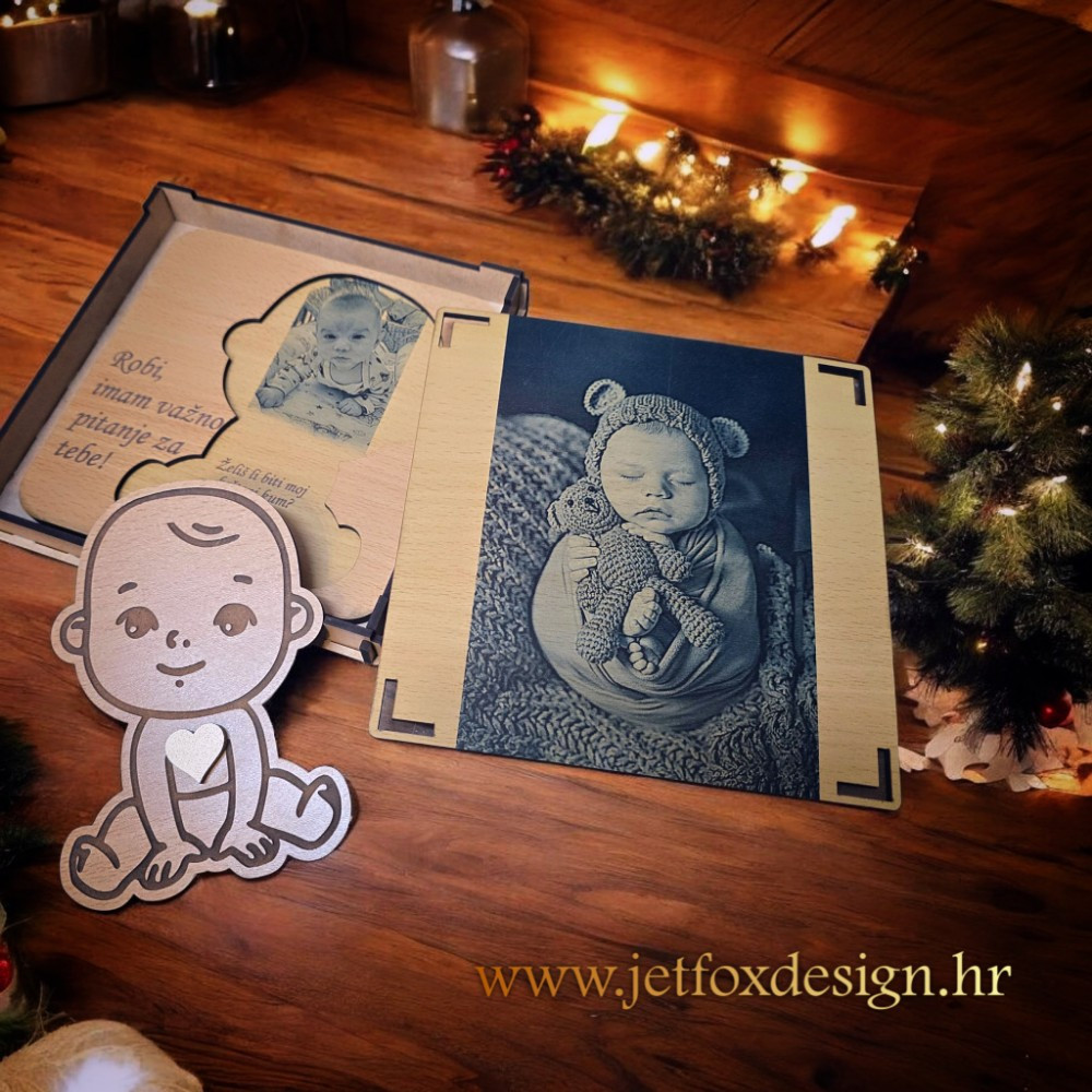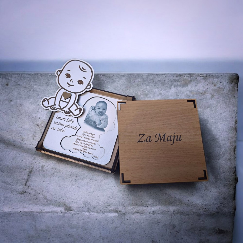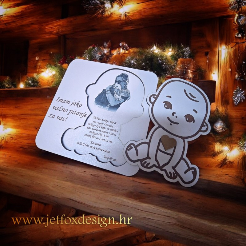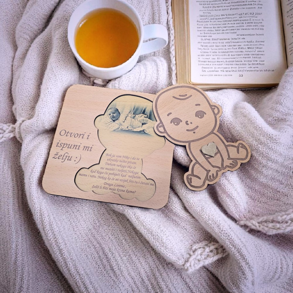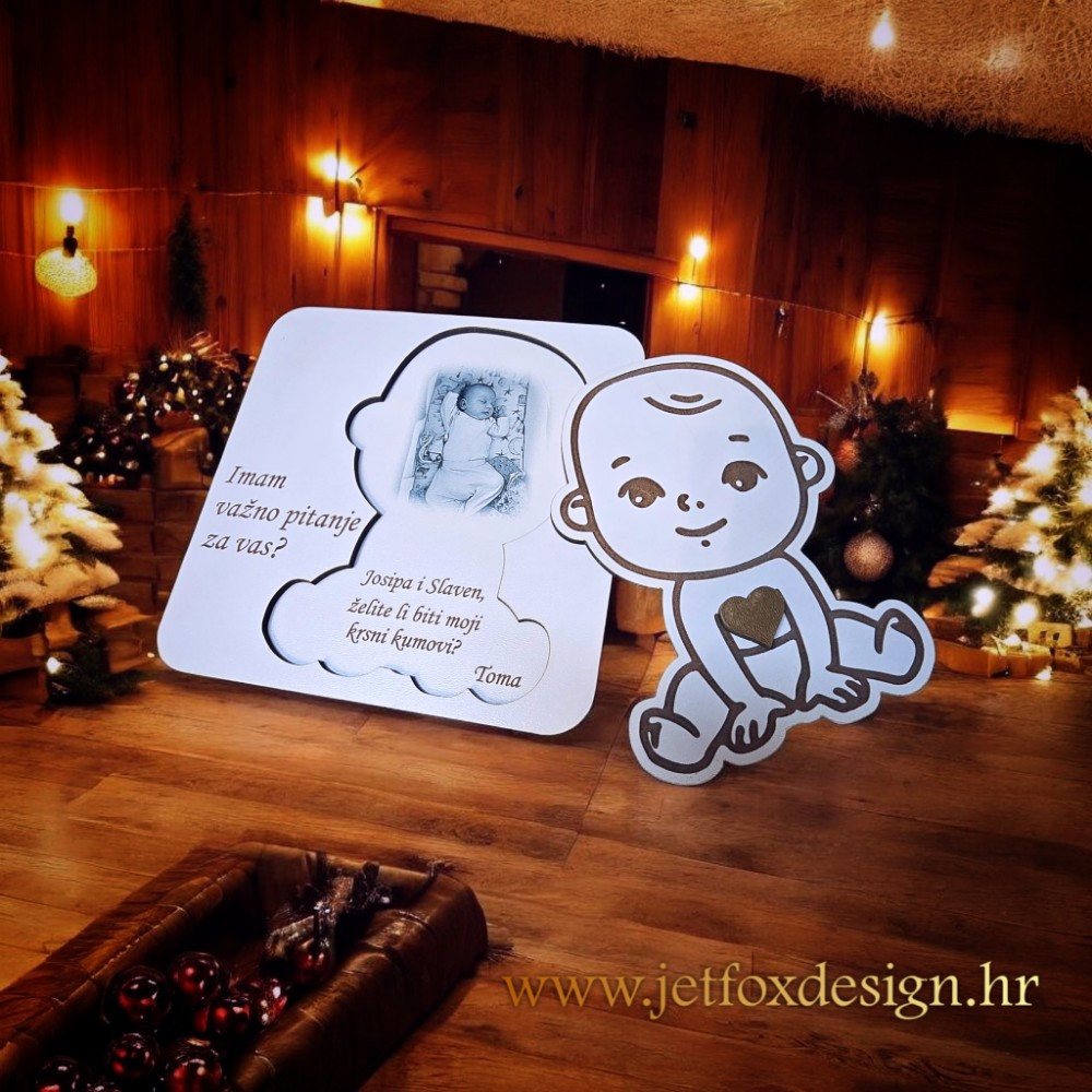 Drvena čestitka u obliku dječaka bebe originalna je i emotivna pitalica osmišljena kao poseban način za postavljanje jednog od najvažnijih pitanja – kumstva. Čestitka je personalizirana imenom djeteta, fotografijom i porukom po želji, a njezin dizajn postupno otkriva pitanje: „Želiš li biti moj kum?“ ili „Želiš li biti moja kuma?“. Time ovaj trenutak postaje nezaboravan i pun emocije.