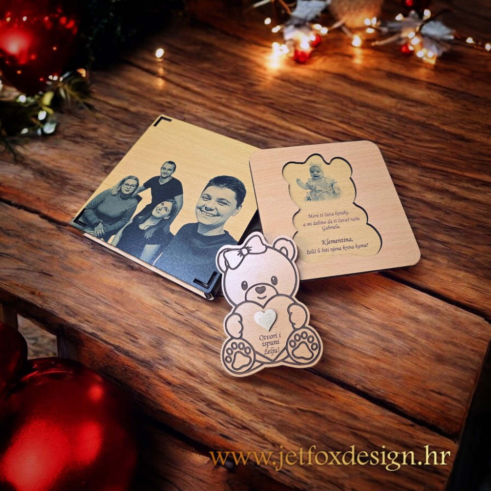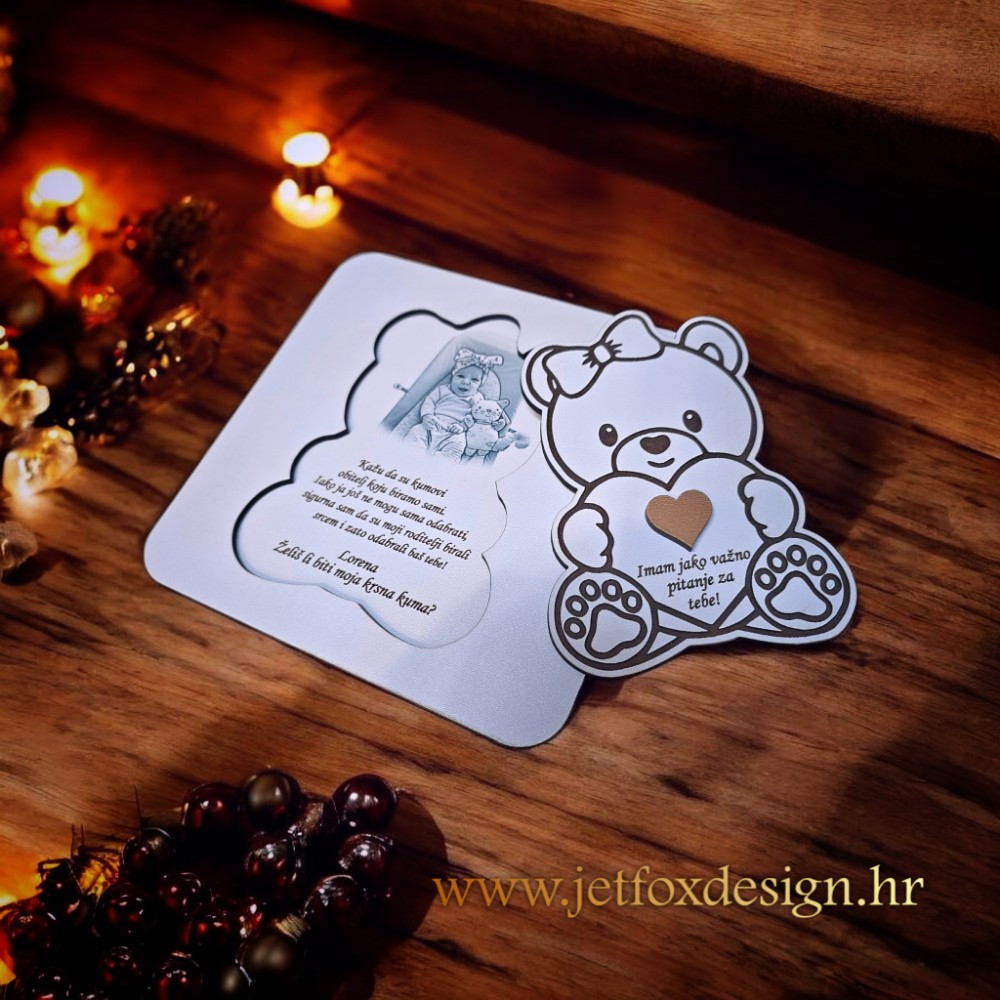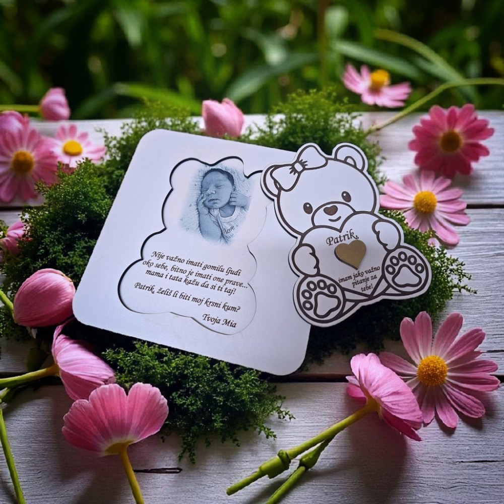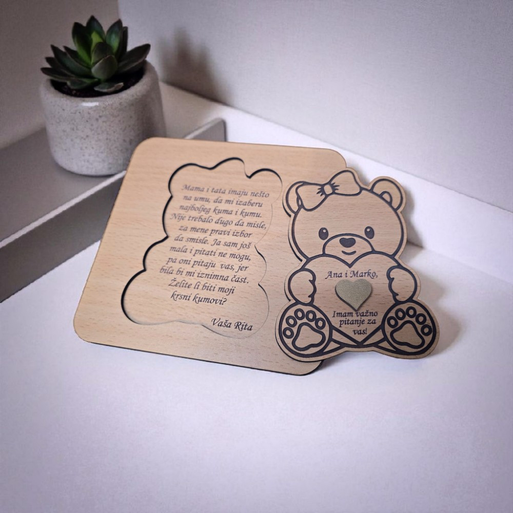 Drvena čestitka pitalica u obliku mede curice s fotografijom i imenima poseban je način kako pitati Želiš li biti moja kuma. Nježna, emotivna i trajna uspomena.