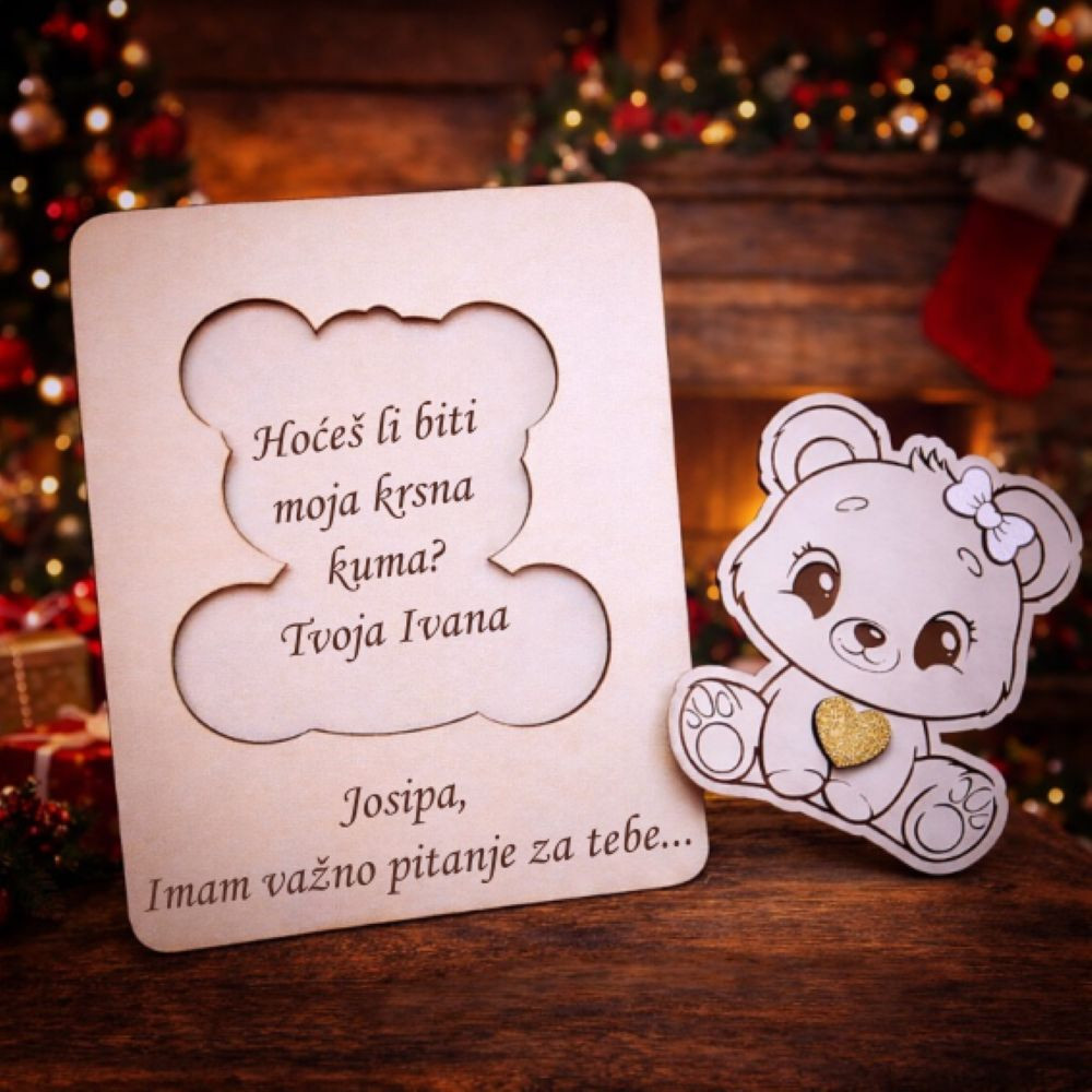 Drvena čestitka pitalica za kumu s motivom malog mede curice mali je predmet koji nosi veliku odluku.