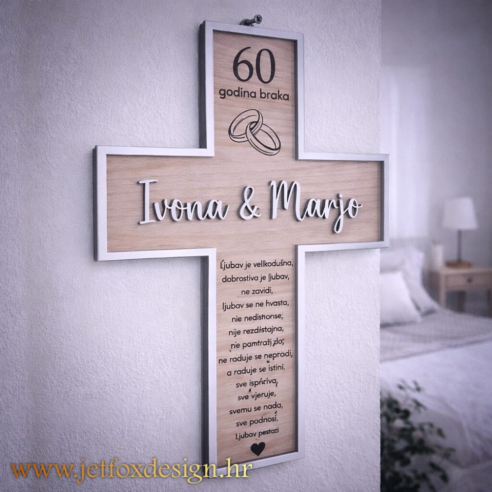 Drvena dekoracija križ s tekstom za godišnjicu braka predstavlja simbol vjere, ljubavi i zajedništva koje traje kroz godine. Ovaj personalizirani poklon izrađuje se s pažnjom, a tekst, imena ili datum čine ga osobnom uspomenom koja ima duboko značenje.