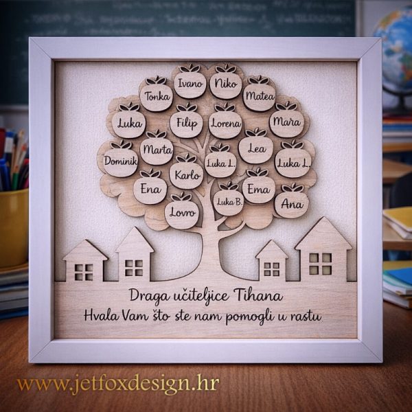Drvena dekoracija za učiteljicu nije samo predmet – to je zahvala urezana imenom svakog djeteta. Poklon koji se ne zaboravlja.
