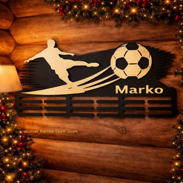 Personalizirani držač za medalje s motivom nogometaša u udarcu izrađen je za dječake koji žive za nogomet. Ime po želji precizno je izrezano, a dinamičan motiv lopte daje snažan sportski karakter. Čvrste prečke omogućuju uredno i pregledno vješanje svih medalja osvojenih na turnirima, natjecanjima i školskim prvenstvima.