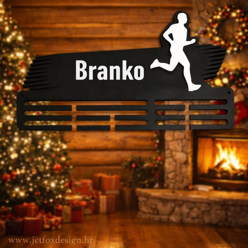 Personalizirani držač za medalje izrađen je od čvrstog metala i dizajniran za sve koji žive sport. Na vrhu se nalazi vaše ime, dok silueta trkača dodatno naglašava strast prema trčanju. Više vodoravnih utora omogućuje vješanje većeg broja medalja – od prvog školskog krosa do maratona.