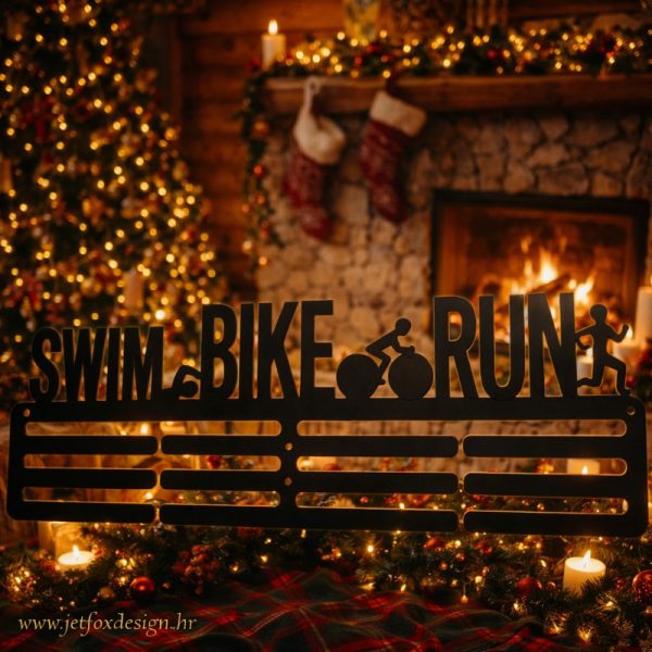 Personalizirani držač za medalje triatlon namijenjen je svima koji znaju što znači ustati prije zore, trenirati po kiši i ne odustati na zadnjem kilometru. Natpis Swim Bike Run simbolizira tri discipline koje čine jednu strast.