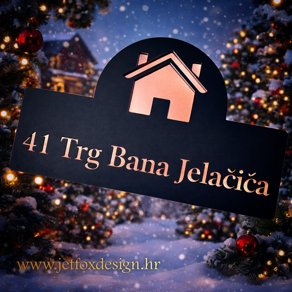 Pravokutni oblik pruža stabilnu i urednu osnovu, dok ikona kuće unosi vizualni fokus i jasno definira ulaz u dom. Kućni broj s ikonom kuće lijepo se uklapa na obiteljske kuće, novogradnje, ali i vikendice ili kuće za odmor. Dizajn je čist, pregledan i lako čitljiv, što ga čini praktičnim za svakodnevnu upotrebu.