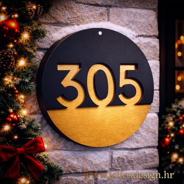 Kružna forma simbolizira cjelinu i stabilnost, dok ravna linija dijeli površinu na uravnotežen i nenametljiv način. Kućni broj s kružnim oblikom i čistom linijom posebno se lijepo uklapa na moderne kuće, novogradnje i objekte koji prate arhitektonsku jednostavnost. Dizajn je jasan, lako čitljiv i vizualno ugodan iz svakog kuta.