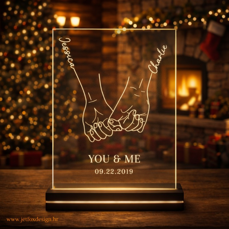 Personalizirana LED lampa s imenima i datumom savršen je način da obilježite početak vaše ljubavne priče. Minimalistički crtež ruku koje se drže simbolizira povezanost, povjerenje i zajedništvo, dok imena i važan datum čine ovaj poklon potpuno osobnim. Toplo LED svjetlo stvara intimnu atmosferu i pretvara ovu lampu u trajnu uspomenu.