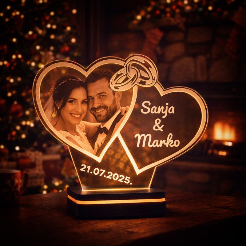 Personalizirana LED lampa s prstenjima idealan je poklon za vjenčanje i godišnjicu braka. Elegantni motiv, toplo svjetlo i imena po želji stvaraju trajnu uspomenu.
