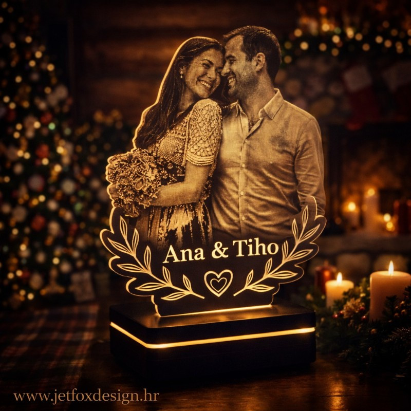 Personalizirana LED lampa sa siluetom prema fotografiji i imenima moderan je i emotivan poklon za godišnjicu, Valentinovo ili obiteljsku uspomenu. Minimalistički dizajn i vaša priča u svjetlu.