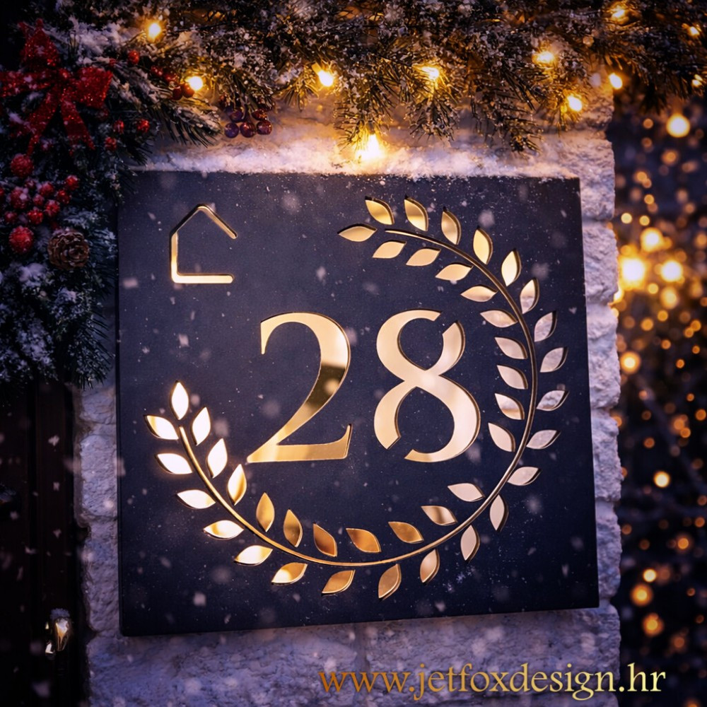 Kućni broj je prva stvar koju gosti, dostavljači i prolaznici primijete. Ovaj luksuzni personalizirani kućni broj izrađen je s naglaskom na čiste linije, kontrast tamne podloge i svijetlih rezanih detalja te dekorativni vijenac koji daje osjećaj elegancije i ravnoteže. Upravo zato savršeno se uklapa u moderne kuće, vile i novogradnje.