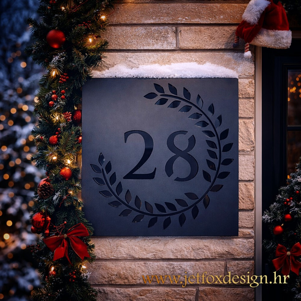Reljefni vijenac u kružnoj formi daje osjećaj sklada, zatvorenosti i smirenosti. Ovaj minimalistički personalizirani kućni broj s reljefnim biljnim vijencem idealan je za moderne kuće, urbane vile i fasade koje prate čiste linije i jednostavne oblike. Tamna podloga dodatno naglašava eleganciju i daje dojam diskretnog luksuza.
