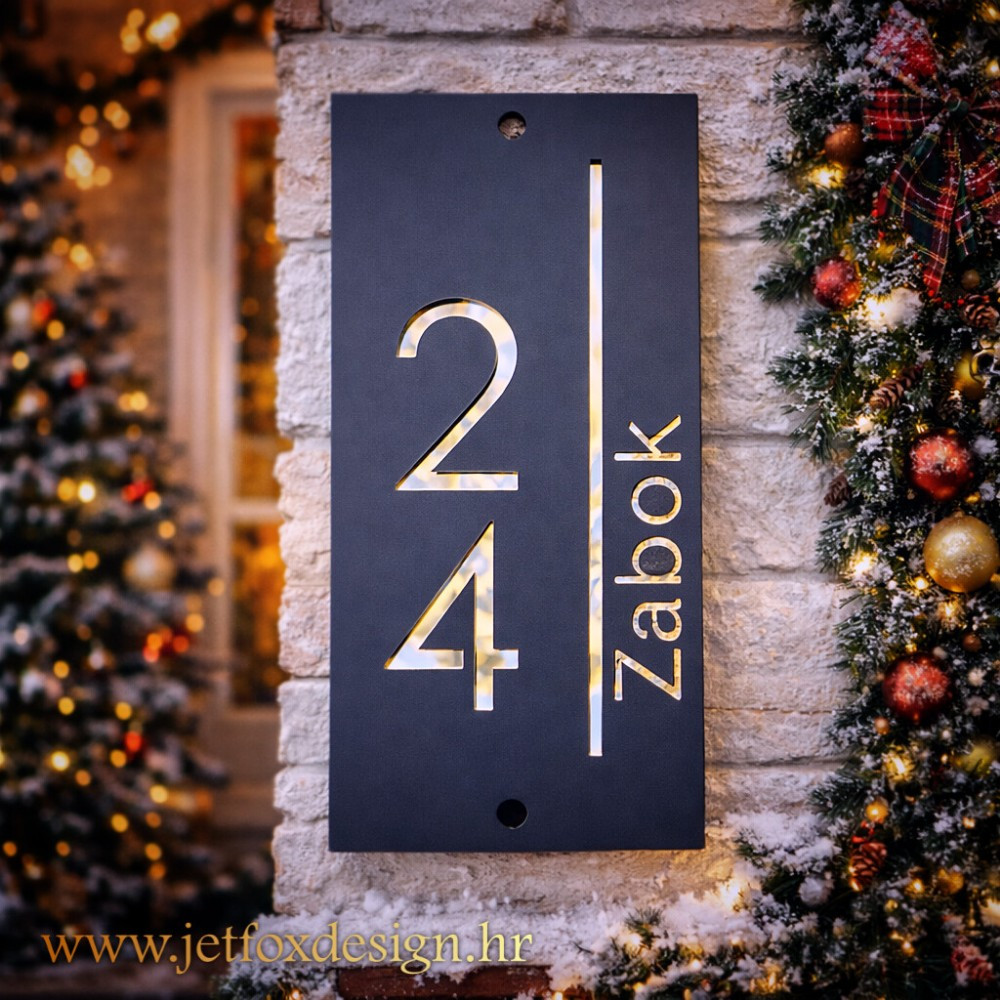Vertikalna linija kao glavni dizajnerski element unosi osjećaj visine, reda i arhitektonske ravnoteže. Ovaj moderni personalizirani kućni broj s vertikalnim minimalističkim motivom posebno dolazi do izražaja na suvremenim fasadama, novogradnjama i objektima koji prate moderan stil gradnje. Dizajn je nenametljiv, ali dovoljno snažan da se odmah primijeti.