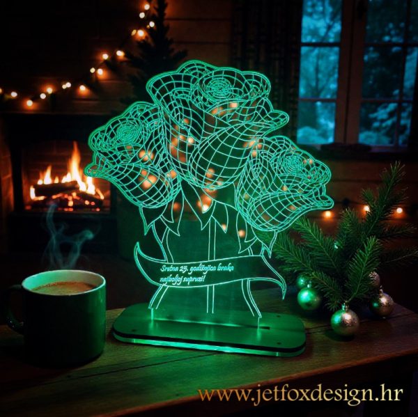 - Motivi i tekst se laserski graviraju na proizrni akril, te je gravra bijela, boje dolaze od osvjetljenja na postolju (RGB tehnologija)