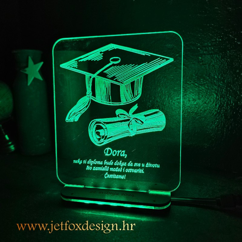 - Motivi i tekst se laserski graviraju na proizrni akril, te je gravra bijela, boje dolaze od osvjetljenja na postolju (RGB tehnologija)