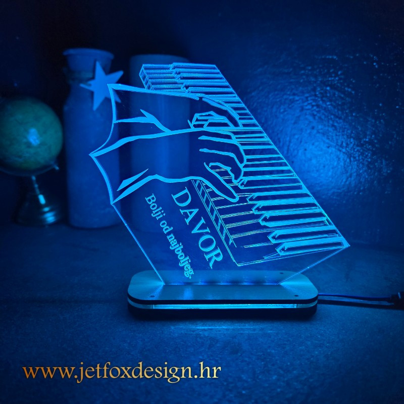 - Motivi i tekst se laserski graviraju na proizrni akril, te je gravra bijela, boje dolaze od osvjetljenja na postolju (RGB tehnologija)