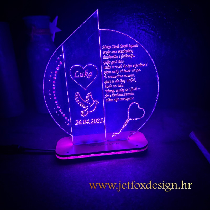 - Motivi i tekst se laserski graviraju na proizrni akril, te je gravra bijela, boje dolaze od osvjetljenja na postolju (RGB tehnologija)