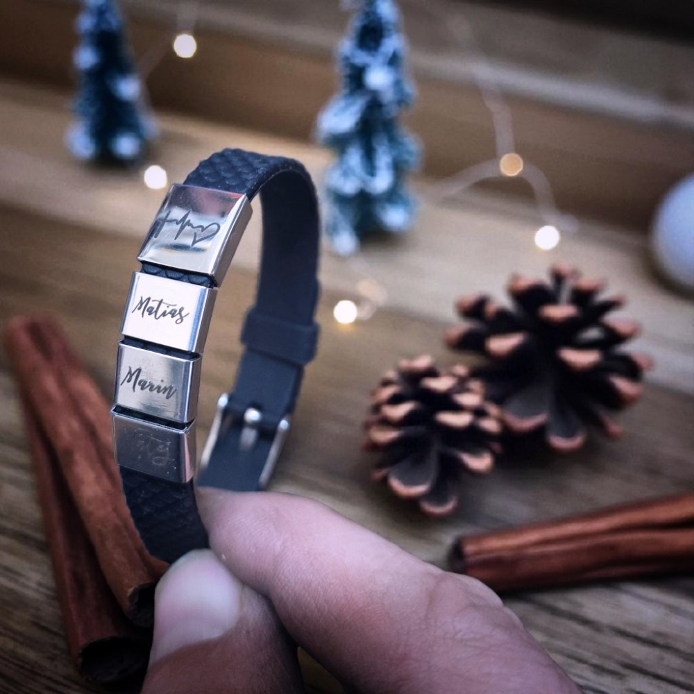 Ova personalizirana gumena narukvica s više čeličnih privjesaka i imenima idealna je za rođendan, godišnjicu, Dan očeva, Valentinovo ili kao poklon bez posebnog povoda. Pitate se što pokloniti muškarcu, partneru, roditelju ili osobi koja cijeni simbolične, ali nenametljive dodatke? Ovakav poklon ima osobnu vrijednost i svakodnevnu funkciju.