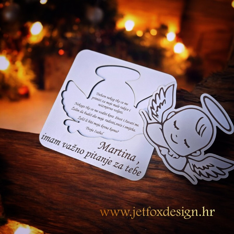 Personalizirana čestitka s natpisom “Kažu da su kumovi obitelj koju biramo sami” i skrivenim pitanjem “Želiš li biti moja kuma?”. Savršen način da postavite ovo posebno pitanje i stvorite trajnu uspomenu.