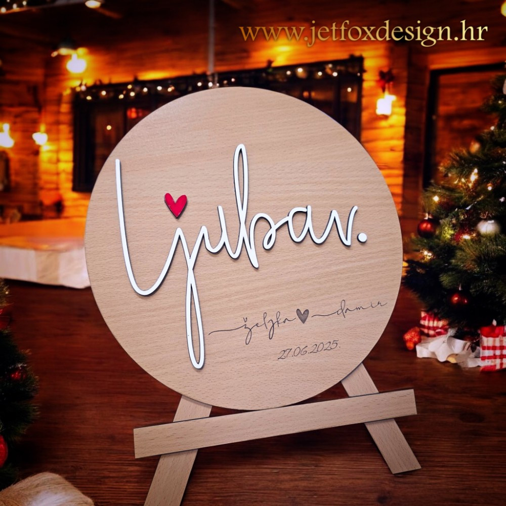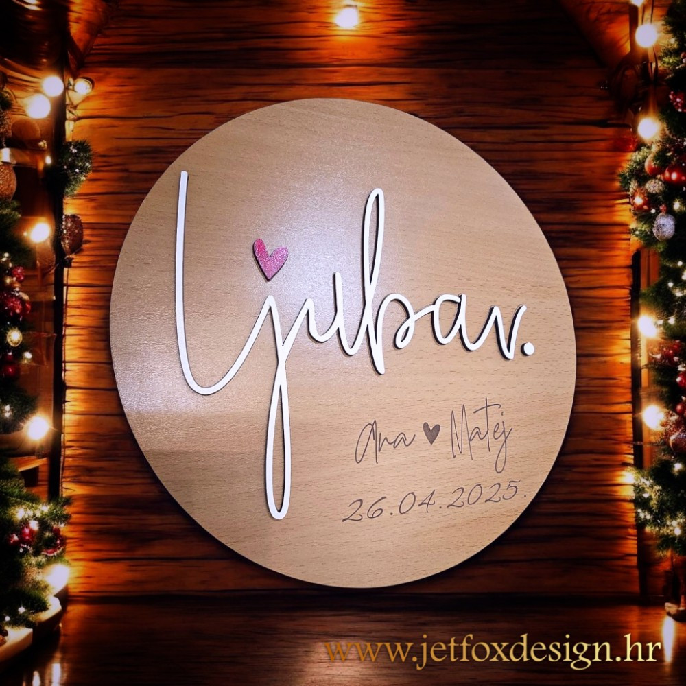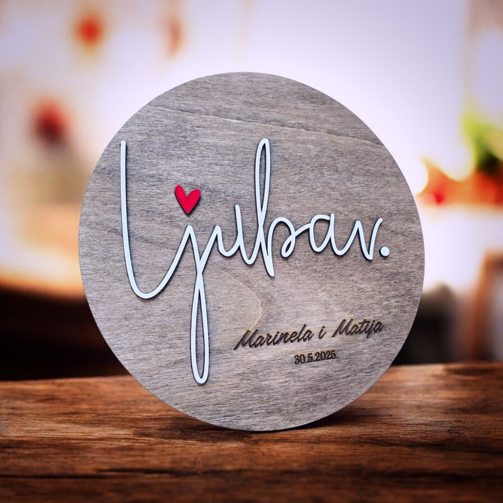 Personalizirana drvena dekoracija s natpisom Ljubav, imenima mladenaca i posebnim datumom simbol je zajedništva i početka zajedničkog života. Riječ „Ljubav“ u središtu dizajna daje jasnu poruku, dok imena i datum vjenčanja, upoznavanja ili godišnjice pretvaraju dekoraciju u osobnu uspomenu. Izrađena je od drveta i namijenjena za postavljanje na stol, policu ili komodu, gdje postaje dio svakodnevnog prostora.
