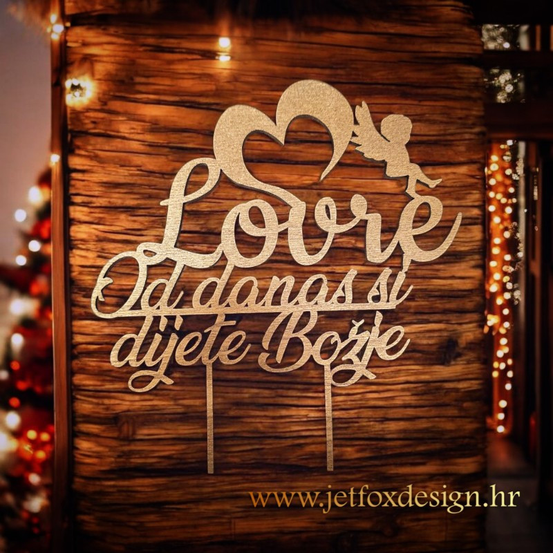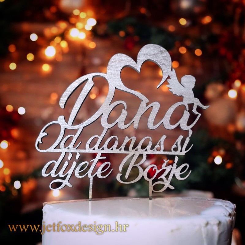 Toper za krštenje s imenom i natpisom Od danas si dijete Božje. Emotivna i simbolična dekoracija za tortu s motivima anđela i srca, stvorena za poseban dan krštenja.