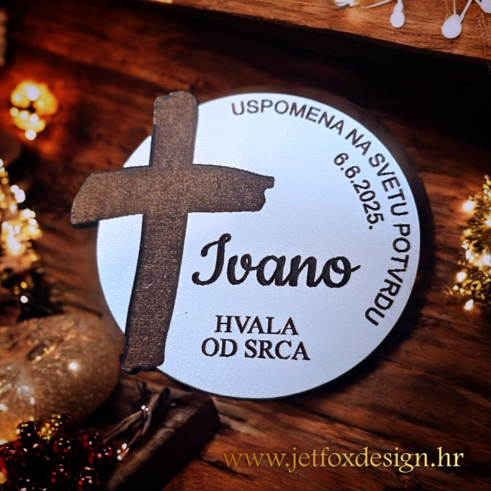 Okrugla zahvalnica s graviranim križem i imenom – uspomena za goste