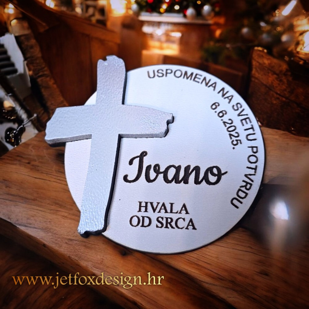 Zahvalnica je kružnog oblika, s jasno izraženim 3D slojem koji daje dubinu i eleganciju. Središnji motiv je srebrni križ, decentan i profinjen, koji se savršeno uklapa u svečani karakter prve pričesti. Ime djeteta i kratka zahvala diskretno su uklopljeni u dizajn, čineći svaku zahvalnicu osobnom i jedinstvenom.