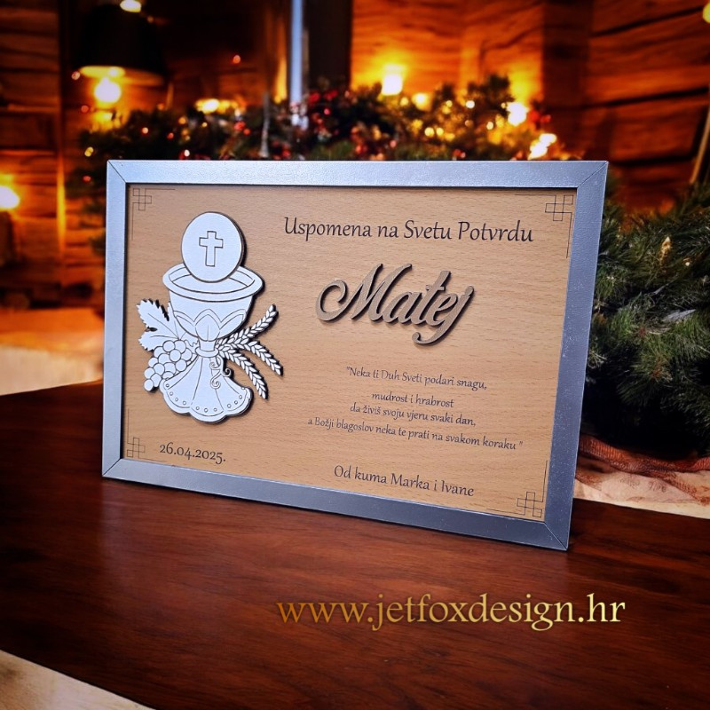 Tražite poseban poklon za krizmanika? Naš personalizirani okvir uspomena s motivom kaleža i imenom slavljenika idealan je dar od kuma za svetu potvrdu. Ovaj elegantni okvir uključuje prostor za fotografiju, ime i prigodnu poruku koja simbolizira vjeru i duhovnost. Savršen poklon koji osigurava da trenutak svete krizme ostane trajna uspomena. Neka krizma ostane u sjećanju uz ovaj jedinstveni dar od srca!