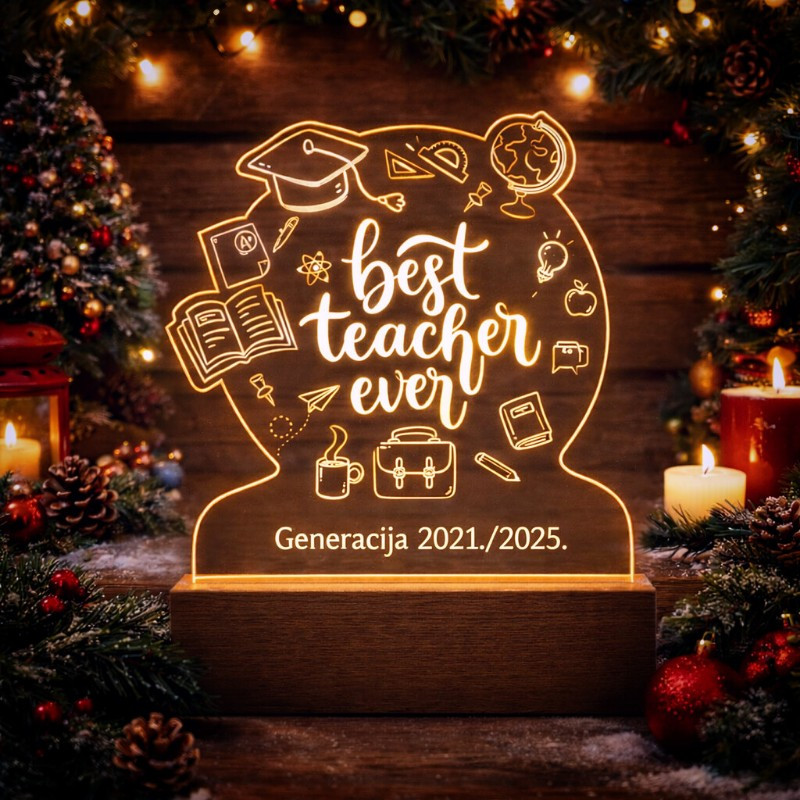 Personalizirana akrilna lampa s natpisom Najbolja učiteljica izrađena je od kvalitetnog akrila koji stvara izražen 3D efekt i daje lampi poseban vizualni dojam. LED lampa mijenja boje i pruža ugodno, toplo svjetlo koje se savršeno uklapa na radni stol, policu ili u učionicu. Po želji se dodaje ime učiteljice, razreda ili kratka poruka, čime lampa postaje potpuno personalizirana i jedinstvena.