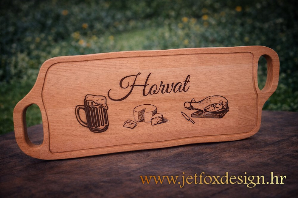 Tražiš ideju koja nije bezlična i koja će se stvarno koristiti? Personalizirana daska za posluživanje s imenom i motivima hrane spoj je praktičnosti i osobnog detalja koji se pamti. Na dasci je elegantno ugravirano prezime ili ime po želji, uz ilustracije piva, sira i mesnih delicija – baš onako kako izgleda pravo opušteno druženje.