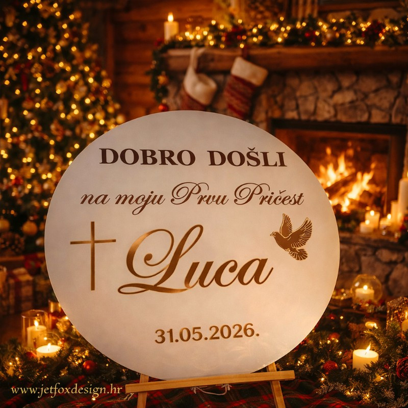 Personalizirana dekoracija za Prvu pričest savršen je detalj za uređenje prostora i doček gostiju. Ime djeteta, datum te simboli križa i golubice čine ovu dekoraciju posebnim znakom jednog važnog sakramenta.
