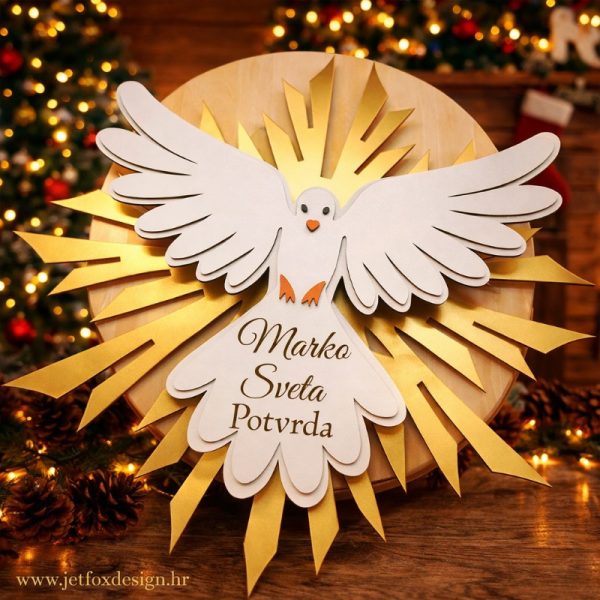 Sveta Potvrda je trenutak kada mlada osoba svjesno potvrđuje svoju vjeru. Ova personalizirana dekoracija s motivom Duha Svetoga simbolizira svjetlo, snagu i blagoslov koji prati krizmanika kroz život.