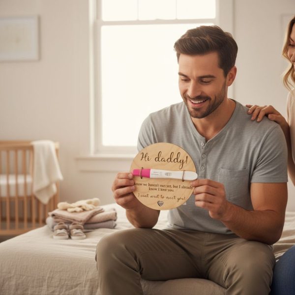 Ako tražite kreativan, emotivan i potpuno unikatan način da partneru priopćite da će postati otac, ova drvena čestitka Postat ćeš otac s prostorom za test trudnoće pruža trenutak koji se pamti zauvijek. Izrađena je kao okrugla drvena pločica s personaliziranim tekstom, savršeno oblikovana da u nju umetnete pravi test trudnoće – čineći iznenađenje potpuno autentičnim.