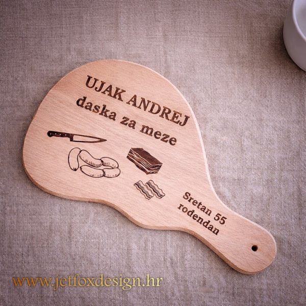 Na dasci je ugraviran natpis „Ujak daska za meze“, uz ilustracije noža, kobasica i suhomesnatih zalogaja. Ime ujaka, rođendanska poruka ili kratka posveta mogu se u potpunosti prilagoditi, kao što je vidljivo na primjeru „Sretan 55. rođendan“. Svaka daska tako postaje osobna i jedinstvena.