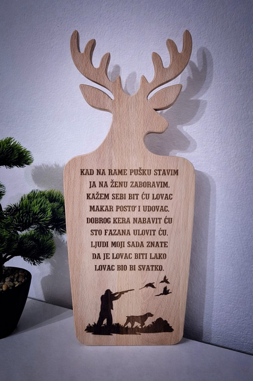 Dekoracija je izrađena u prepoznatljivom obliku s jelenjim rogovima, a na njoj je laserski graviran humorističan lovački tekst, uz siluetu lovca s puškom, psa i divljači. Upravo taj spoj forme i poruke daje ovom poklonu karakter i priču. Tekst se može prilagoditi prema želji, što dekoraciju čini još osobnijom.