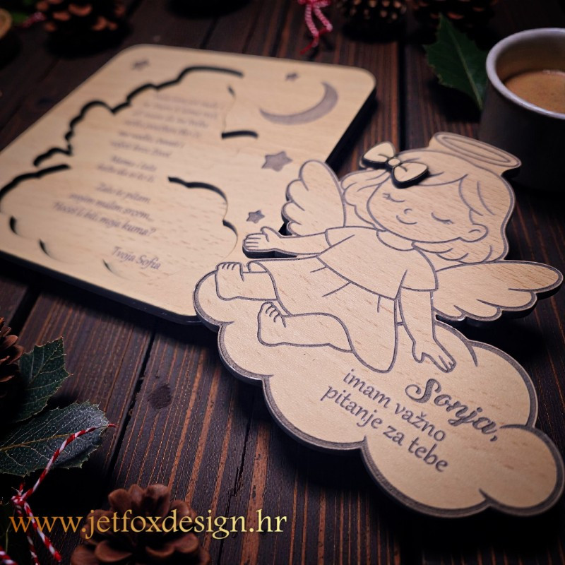 Personalizirana drvena pitalica za kumove nije samo poklon, već emotivna gesta koja nosi poruku važnosti i povjerenja. Mnogi kupci biraju ovakav način postavljanja pitanja jer ostavlja snažan dojam i pruža trenutak iznenađenja koji se pamti cijeli život. Drvo kao materijal daje toplinu i trajnost, dok motiv anđela donosi simboliku ljubavi i zaštite.