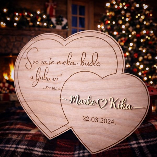 Personalizirana drvena srca s imenima i datumom savršen su simbol ljubavi i zajedničkog života. Gravirani citat „Sve vaše neka bude u ljubavi“ daje ovom poklonu dodatnu vrijednost i poruku koja traje.