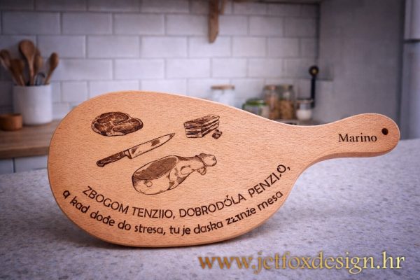 Kuhinja je mjesto gdje se ljudi opuštaju, razmišljaju i stvaraju. Upravo zato personalizirana drvena daska za rezanje s imenom i porukom postaje poklon koji se koristi svaki dan, ali i iznova izmamjuje osmijeh. Na dasci je ugravirano ime, duhovita poruka i ilustracije hrane koje jasno govore kome je namijenjena.