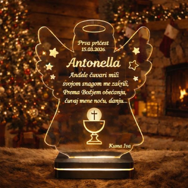 Personalizirana lampa anđeo s imenom savršen je poklon za prvu pričest i crkvene sakramente. Nježno svjetlo i simbolika čine je trajnom uspomenom za dječju sobu.